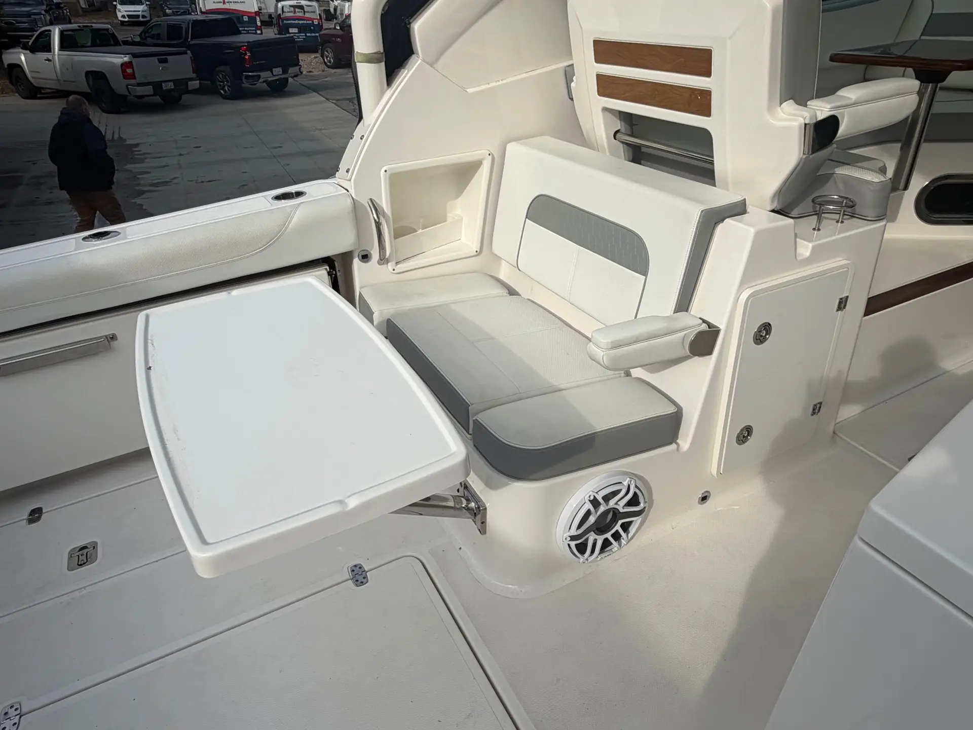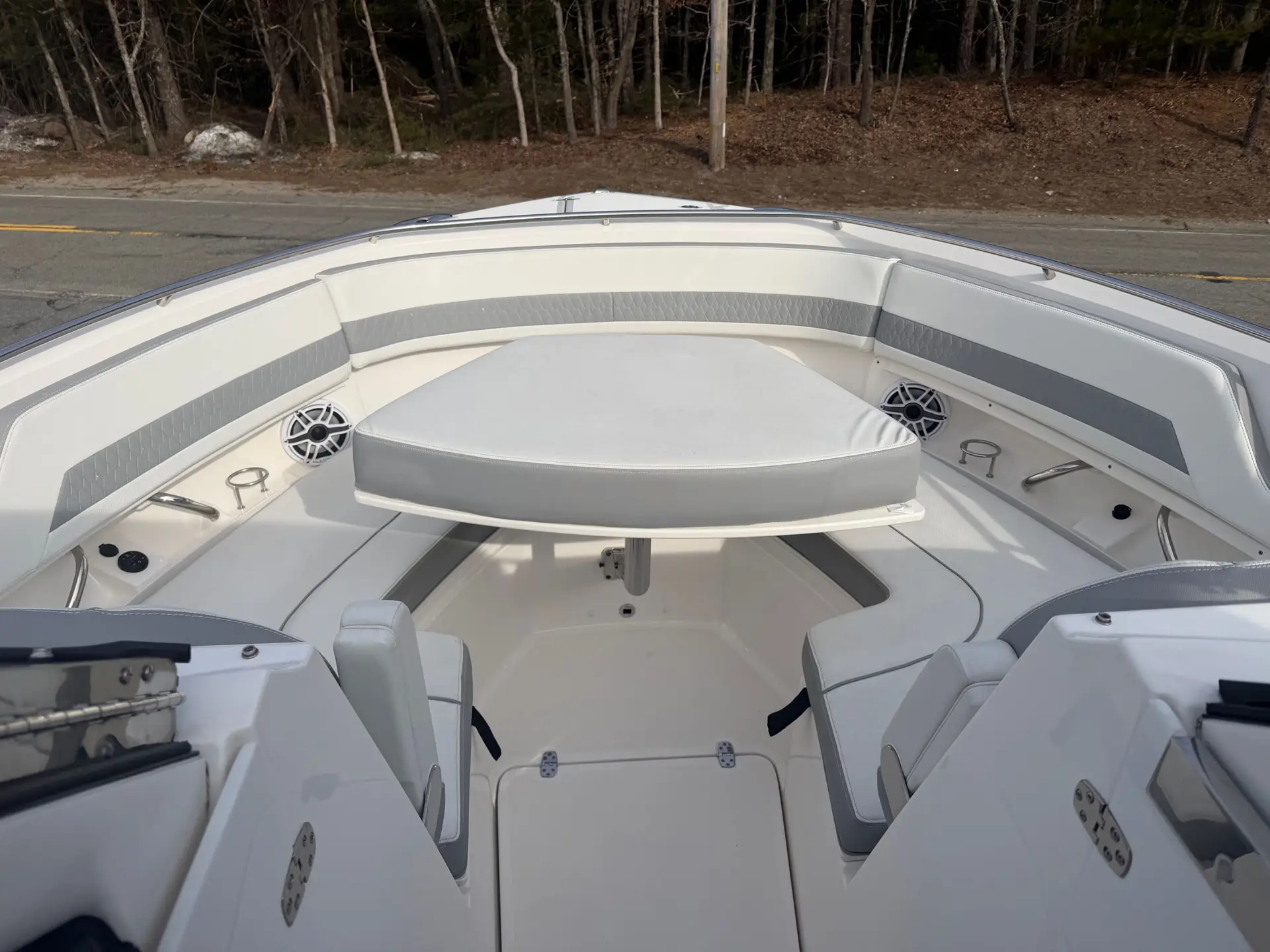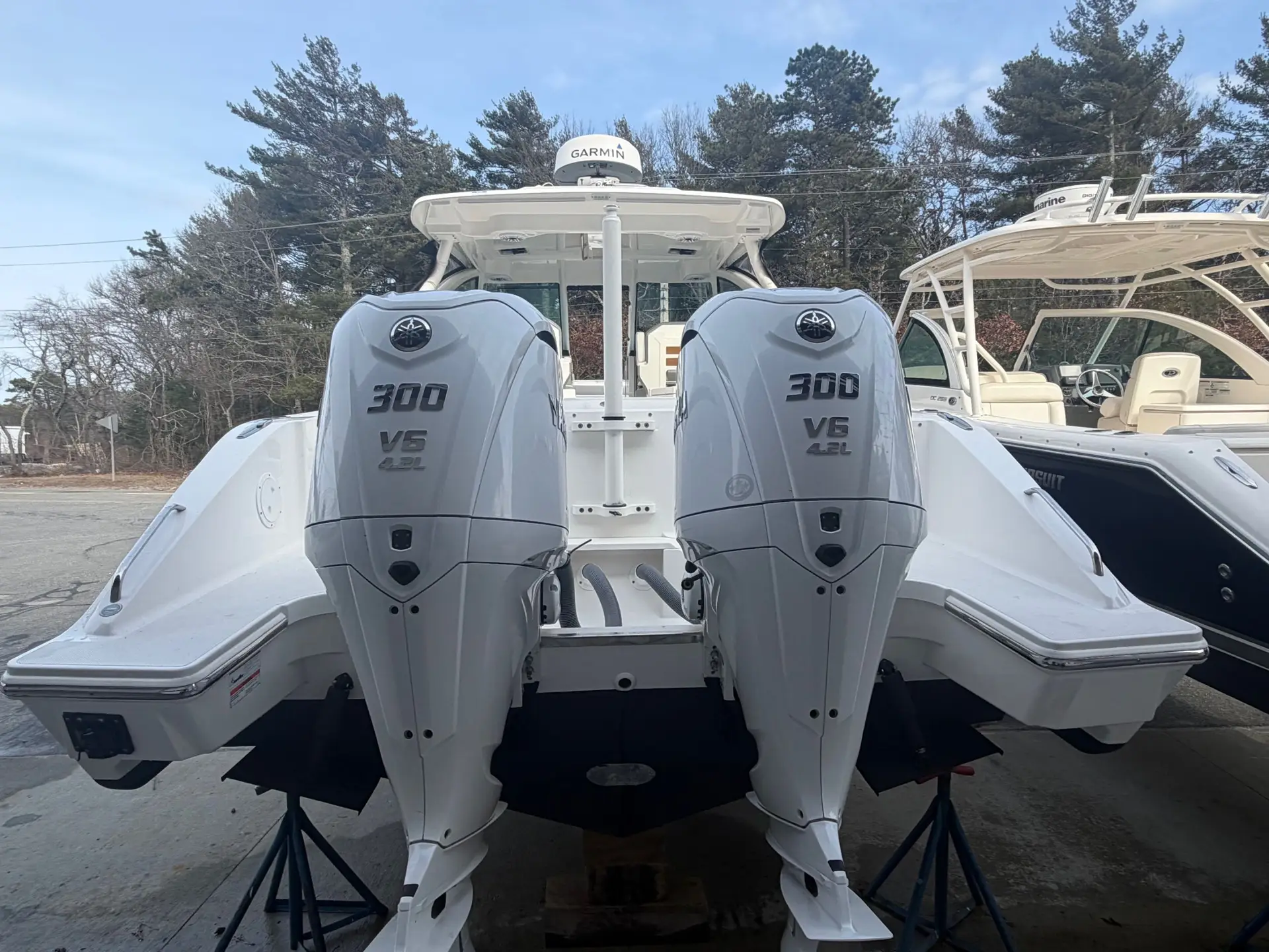 This boat comes to us as a trade in with only 250 hours of use. The hull is finished in Neptune Gray, it boasts an Artic White/Quartz Gray Bootsripe. This 326 comes with the white upholstery upgrade, carbon helm and black canvas to protect it all. The state of the art electronics package includes 2 X Garmin 8612 displays, a Garmin 24x HD Radar. The Yamaha Joystick with Full Maneuverability and a bow thruster. It is also equipped with a ACR 100 led remote control spotlight. Other notable upgrades are the Bridge Deck Teak Table with storage, Ski Tow, Black Tonneau Cover and Black Side Curtains.