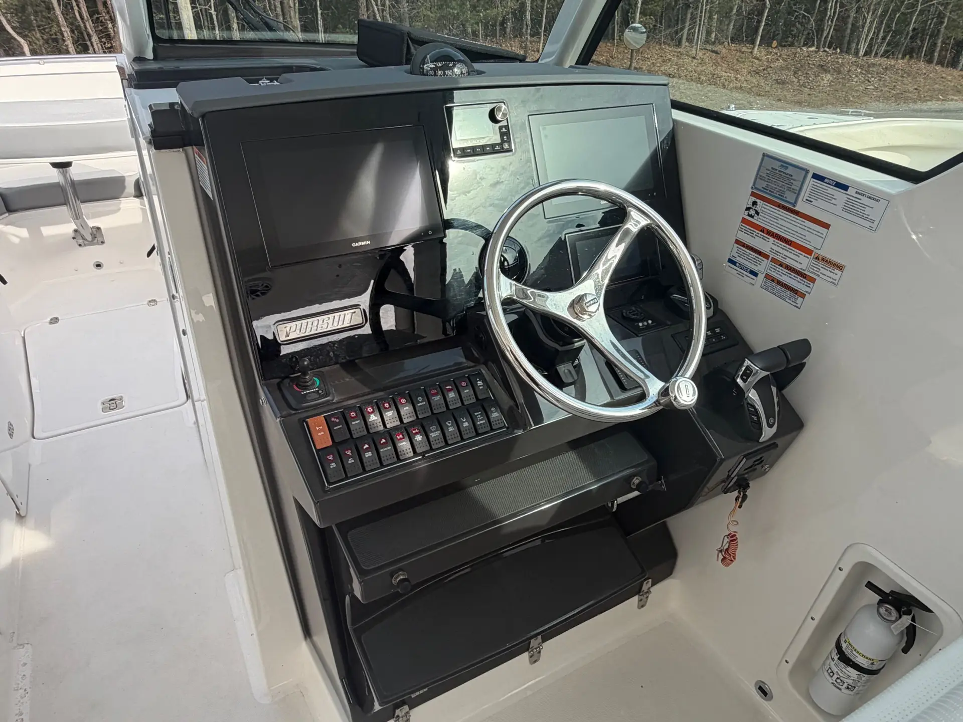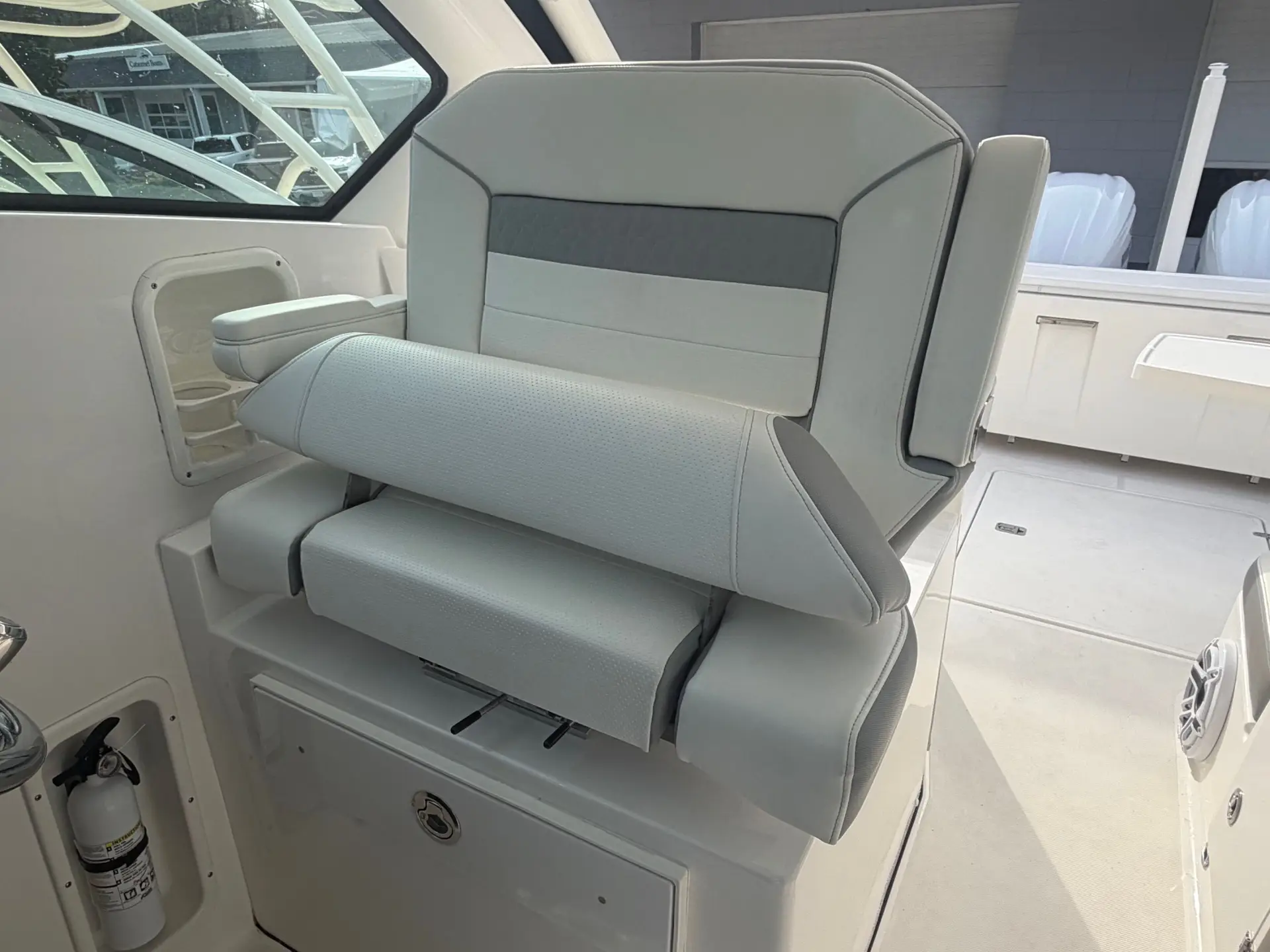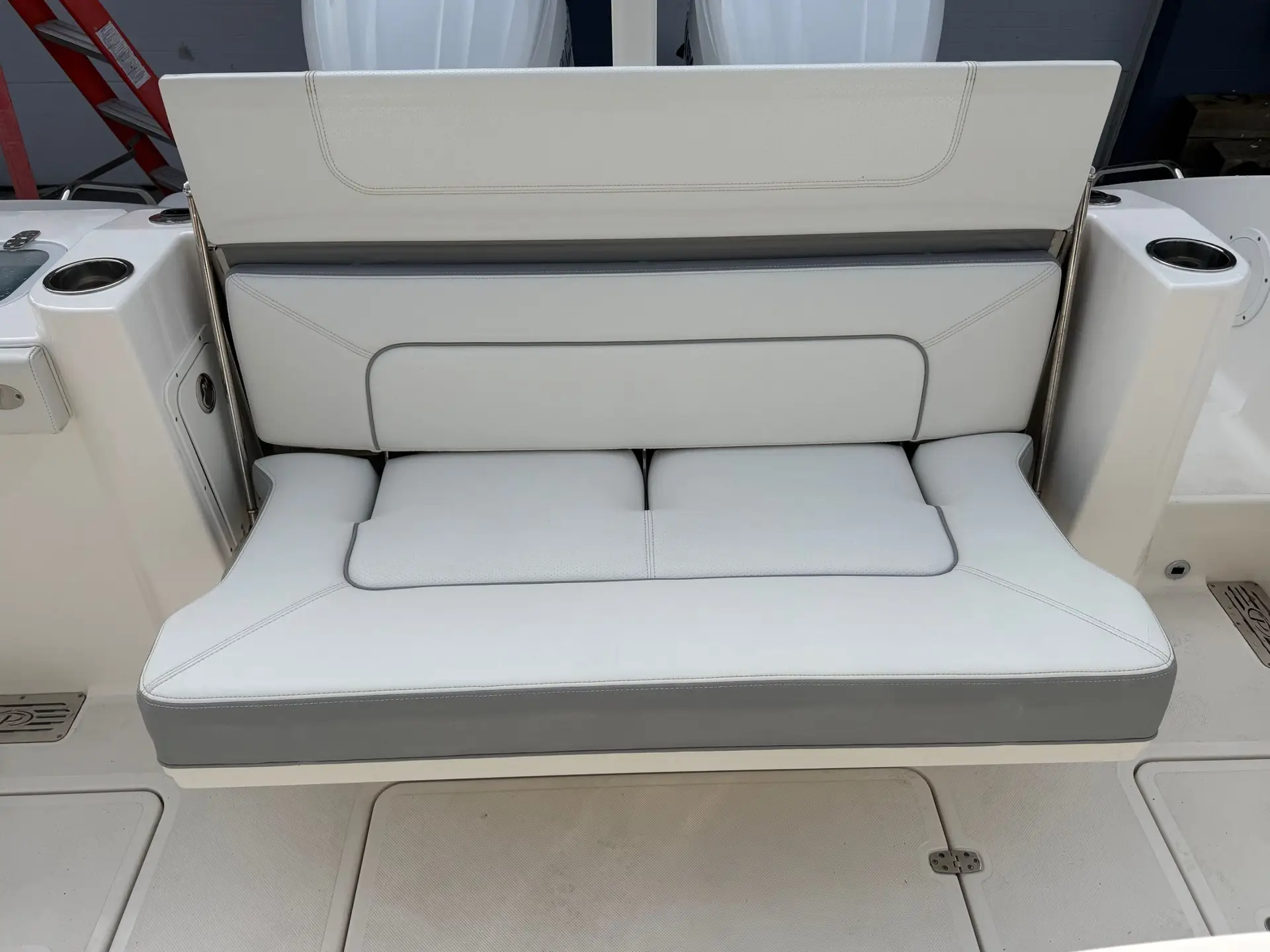 This boat comes to us as a trade in with only 250 hours of use. The hull is finished in Neptune Gray, it boasts an Artic White/Quartz Gray Bootsripe. This 326 comes with the white upholstery upgrade, carbon helm and black canvas to protect it all. The state of the art electronics package includes 2 X Garmin 8612 displays, a Garmin 24x HD Radar. The Yamaha Joystick with Full Maneuverability and a bow thruster. It is also equipped with a ACR 100 led remote control spotlight. Other notable upgrades are the Bridge Deck Teak Table with storage, Ski Tow, Black Tonneau Cover and Black Side Curtains.
